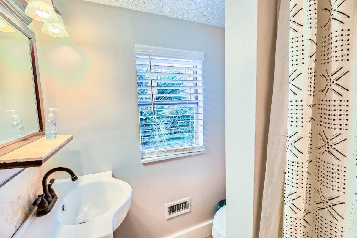 The house is an A frame design with parking underneath. The first floor is second story with comfortable living area with dining area, kitchen and two of the 4 bedrooms. Downstairs bedrooms have one master with king bed the other bedroom has full and bunk bed. One of the two baths is on this level